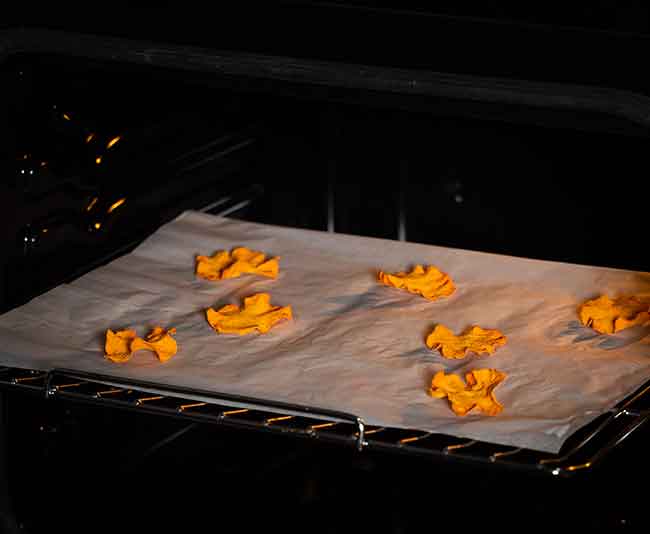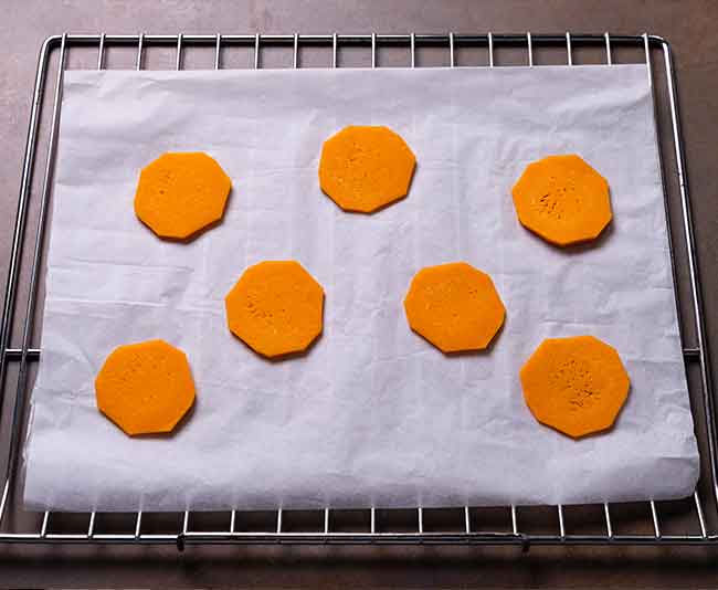 Poner en bandeja de horno de rejilla sobre papel vegetal la calabaza, introducir en horno caliente a unos 55º C durante unas 12 horas