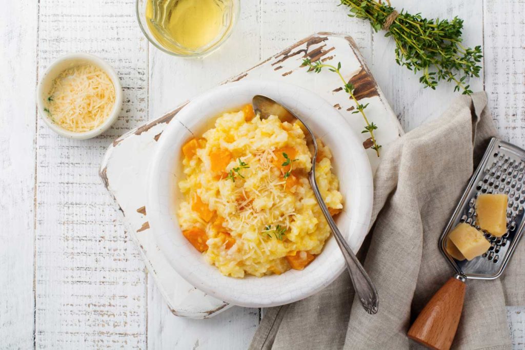 El risotto de calabaza es típico de la gastronomía italiana, donde la calabaza tiene un papel importante. Está presente en multitud de platos, como este arroz meloso con un exquisito toque dulce que, junto con el queso parmesano, hacen una estupenda combinación para el paladar. Una receta fácil, económica y apta para veganos.